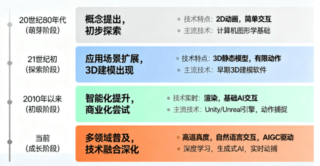 手艺冲破取快速成长阶段(2010年-2020年):深度进修、人工智能(AI)和大模子手艺的兴起是这一阶段的环节。但项目周期长(数月),